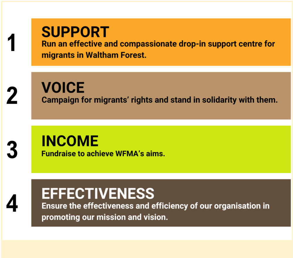 Our mission is to provide support and advice for local migrants and refugees in Waltham Forest. We also advocate and campaign for the rights of migrants and refugees in the UK.