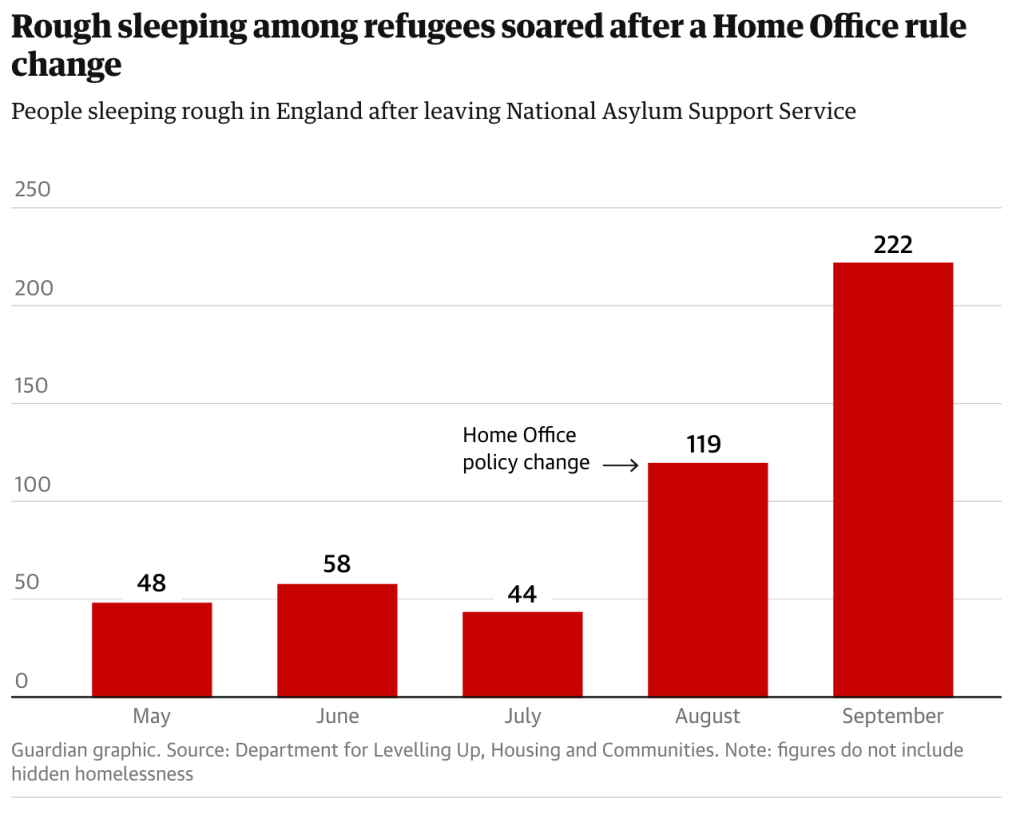 Some good news: after the departure of Robert Jenrick, the Home Office has abandoned its cruel and chaotic 7-day eviction policy, which was leaving many newly granted refugees street homeless after being evicted from their asylum support accommodation. It was never going to be enough time to find alternative housing and get social security support. You can see from the table below how drastic the increase was.