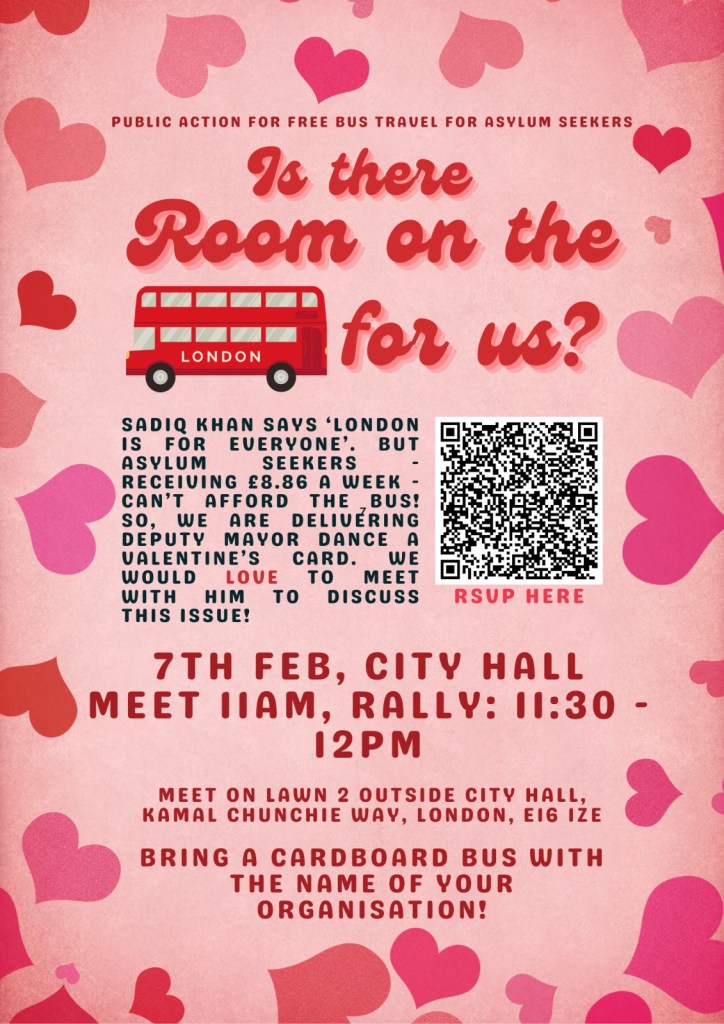 Save the date! On 7 February, Citizens UK and a coalition of community leaders, asylum seekers and grassroots campaigners from across London will gather outside London City Hall to deliver a Valentine’s Day card to Seb Dance, Deputy Mayor of Transport for London and ask for a “date” to meet and discuss access to bus travel for asylum seekers – bringing along creatively designed ‘love buses’ artwork, a collaborative effort crafted by various community groups and people seeking asylum.
