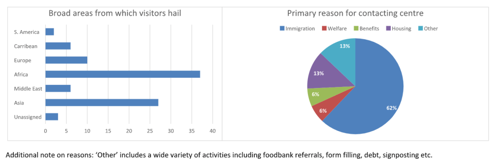 Immigration is back to making up more than half as the primary reason for contacting the centre. In addition, on Wednesdays, we are seeing more people to help them with their eVisas. As we highlighted on the website earlier this year, the Home Office have decided that every single person that has any type of visa (babies and children included) must swap from a physical permit (or occasionally a vignette in a passport) to a ‘virtual’ visa or ‘eVisa’ by the end of this year. It is not difficult to do if you have a smart phone that can be used for contactless payments and it requires patience as it involves repeated sending of codes to phones or emails.