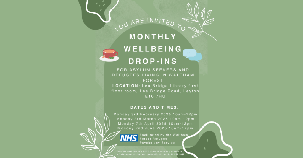The Waltham Forest refugee psychology team is starting a monthly wellbeing drop in for refugees and asylum seekers, starting this coming Monday 03 February, between 10.00 and 12.00, at Lea Bridge Library, Lea Bridge Road