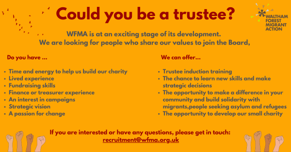 We are looking for new trustees to join Waltham Forest Migrant Action (WFMA) at a pivotal time for the organisation. We are recruiting across a wide range of skills to help us on the path to sustainable growth. Importantly, we are looking for people passionate about migrant justice.
