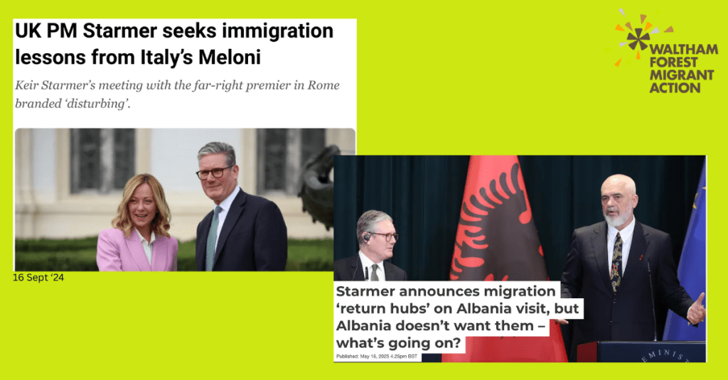 How we briefly rejoiced when the Rwanda Scheme was scrapped … then came the trip to Italy in September 2024 to begin discussions with Italy’s far-right PM. Last week, Keir Starmer visited Albania and became the first British PM to visit Albania since the two countries established diplomatic relations, in 1921. The main objective of his trip was to set up of return migration hubs in Albania, to send people whose asylum claims have been rejected – but it didn’t go as planned. Albanian Prime Minster, Edi Rama, made clear he doesn’t support the idea. They already have a similar agreement in place with Italy, that is proving legally and politically challenging.