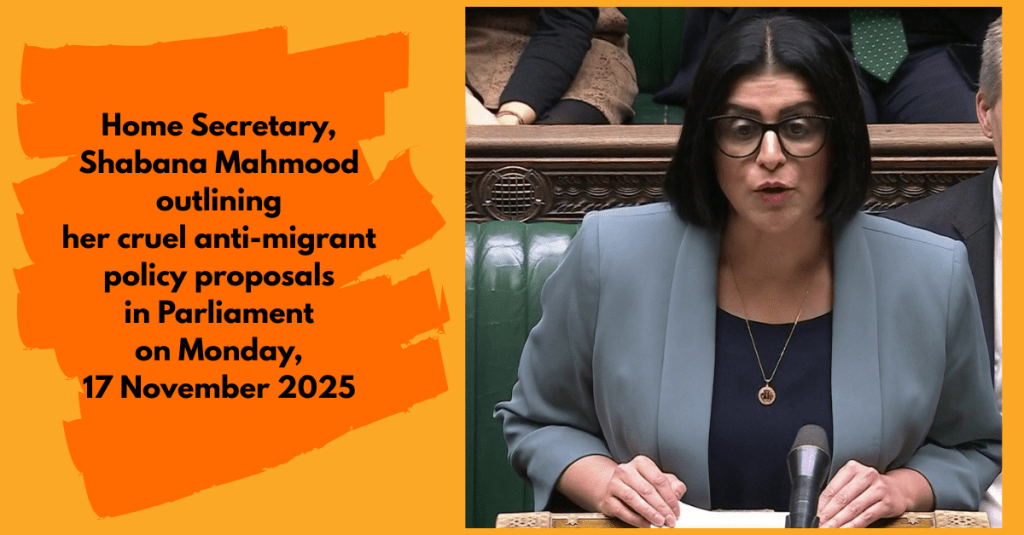 After touring TV news programmes on Sunday, Home Secretary, Shabana Mahmood presented her version of the hostile environment – ‘Restore Order and Control’ – in Parliament on Monday. The policy paper outlines a number of proposed changes that are as frightening as they are inhumane and counter-productive. They show complete disregard for people seeking safety – people who have fled terrible situations – wars, persecution, climate catastrophe – taken enormous risks, lost everything and are likely be experiencing severe trauma. Worryingly, these policy proposals emulate some of the most extreme rightwing and far-right narratives that dominate public discourse in the UK today.