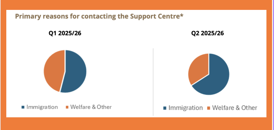 The chart shows a shift over recent weeks in the primary reason for people visiting the drop in. More people are coming to us for immigration advice. Many are expressing deep concerns at the current changes and looming insecurity.